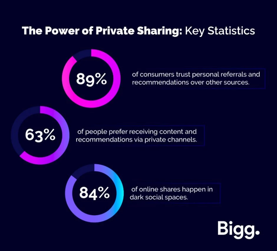 As privacy concerns grow and the social media landscape becomes increasingly saturated, people are shifting towards private communication. In the UK, WhatsApp is one of the most popular apps for staying connected, and private groups on platforms like Facebook and Instagram are thriving. In support of this, a 2019 study revealed that 63% of people preferred to receive content and recommendations via dark social channels, rather than public ones. This shift means businesses need to adapt their digital strategies to meet their audience where they’re most active.
